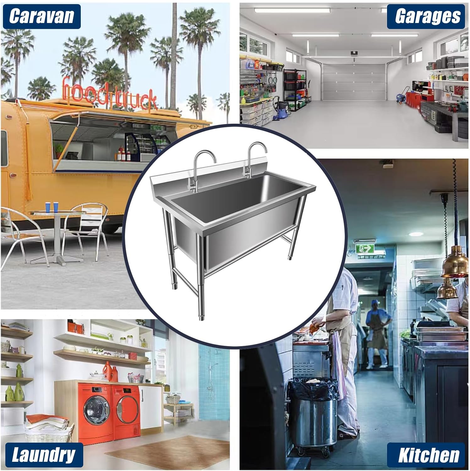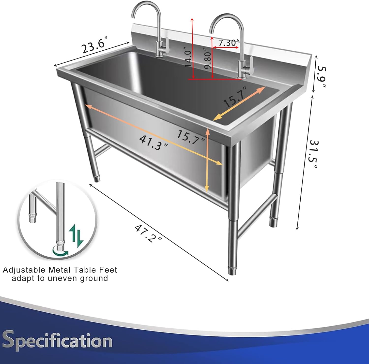 | Included Components | 1-Compartment Sink x 1; Drain Strainer Kit x 1; Sink Legs x 4; Hot and Cold Faucet x 1; Supply hose X 2 |