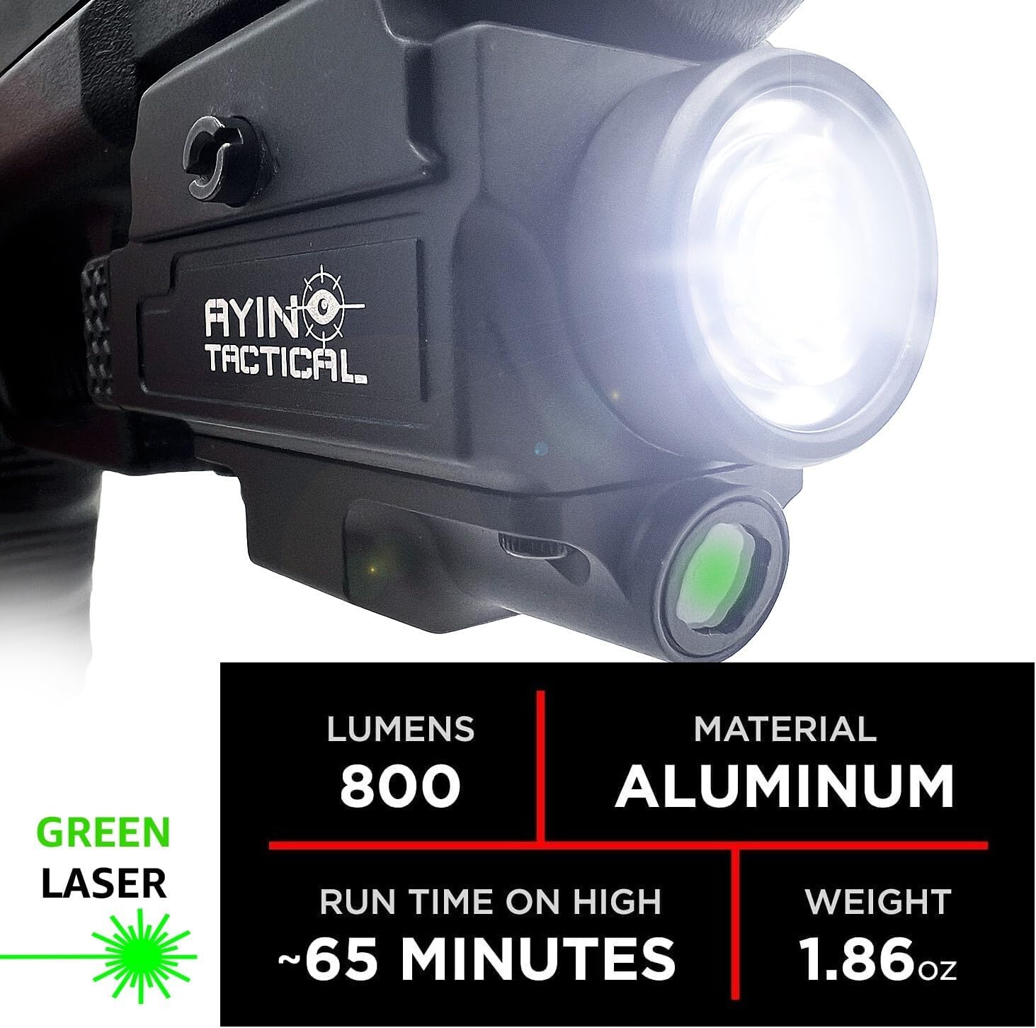 Ayin Tactical ATP-800C Combo Pistol Light, 800 Lumens Rail Mounted Flashlight, USB Rechargeable Tactical Light, Quick Release Weapons mountable light, Light Weight, Easy To Conceal COMPATIBILITY - Glock 17/19/20/22/23/25/32/45, Smith & Wesson M&P M2.0 3.6/4.0/4.25IN M&P M2.0 Full Size, SIG P226/P229/P320v, HK VP9SK, CZP10C, Ruger SR9, Walther, Taurus G2, Similar Full Size Pistols With 1913 Rail. CONVENIENT - Quick Release Allows For Easy On And Off When Wanting To Mount Your Light On A Different Weapon. Quick Lever Secures The Light To Your Weapon So It Stays In Place And Is Ready When You Are. Included Are 2 Mounting Adapters So It Can Be Used On Glock Type Rails Or Picatinny (mil-std-1913) type rails. FLEXABILITTY – The ATP-800 Comes With “Constant On” Feature Or “Momentary On” Feature. Allowing You To Throw 800 Lumens Of Bright White Light Up To 90 Meters Away. It Is Also Equipped With Intelligent Temperature Control And Low-Voltage Warning. POWER – Our Built-in Rechargeable Lithium Battery Wil Give You Up To An Hour Of Tactical “Constant On” Use. Being IP65 dust-proof and waterproof Allows For A Wide Range Of Uses. INCLUDED: ATP-800 with built-in rechargeable battery,1913 Rail Mount (for 1913 Rail), T6/T8 Socket Head Wrench, Micro-USB Charging Cable , User Manual Specifications Manufacturer: Ayin Tactical Model: ATP-800 Material: 6061-T6 aluminum alloy, Type anodizing LED: CREE XP-L HI Size: 52mm x 32.3mm x 25.3mm Max output 800 lumens, lasts 65 minutes Waterproof: IP65 Weight: 52.7g(1.86oz) Max. Throw: 90m