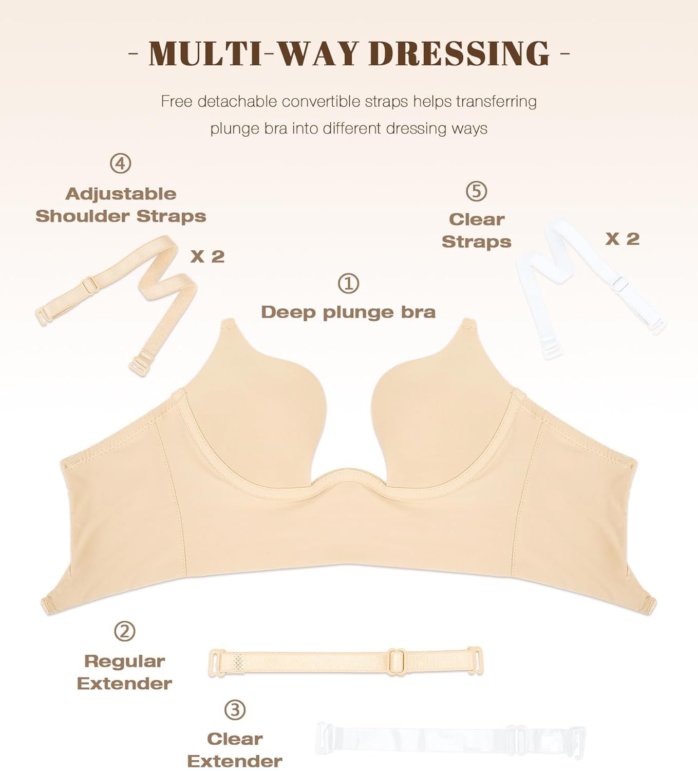 The features of deep plunge and low back/backless with clear straps design is especially good for your strapless backless, halter, deep V plunge, low-cut dresses and tops for the important occasions like wedding, prom, Valentine, anniversary, Christmas, party, housewarming, dating, cos-play, banquet, ceremony and annual meeting. But you better know how to dress correctly for better effect. First, Put on bra. Bend at waist so body is parallel to the ground. Second, with one hand. Slide breast tissue into the cup of bra. Third, Stand and readjust breast so it rests in the moulded cup. Last, Repeat on other side.
