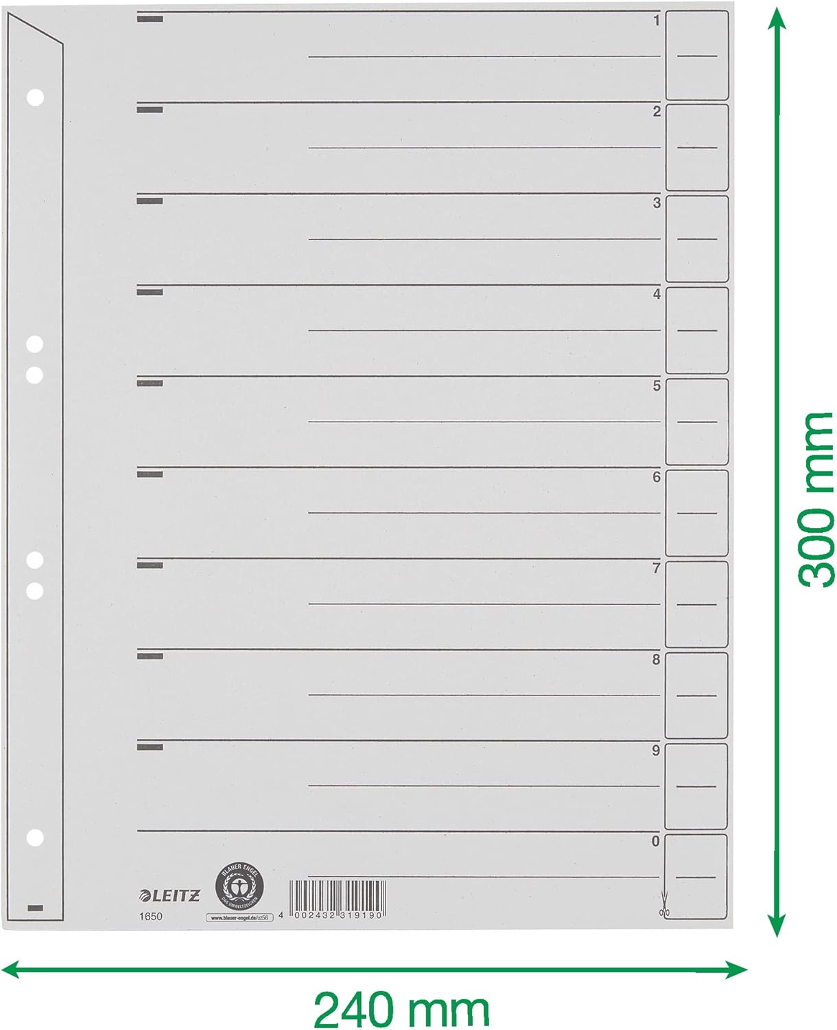 Die Register-Tabe knnen an jeder Stelle angeschnitten werden. Mit berbreite, bei Verwendung von Prospekthllen bleiben die Tabe sichtbar. Linienaufdruck. Lochung hinterklebt. Aus 200 g/qm Kraftkarton (RC). Fr A4. Farbe: grau., Hersteller: Esselte Leitz, Marke: Leitz, Packung mit: 100 Stck