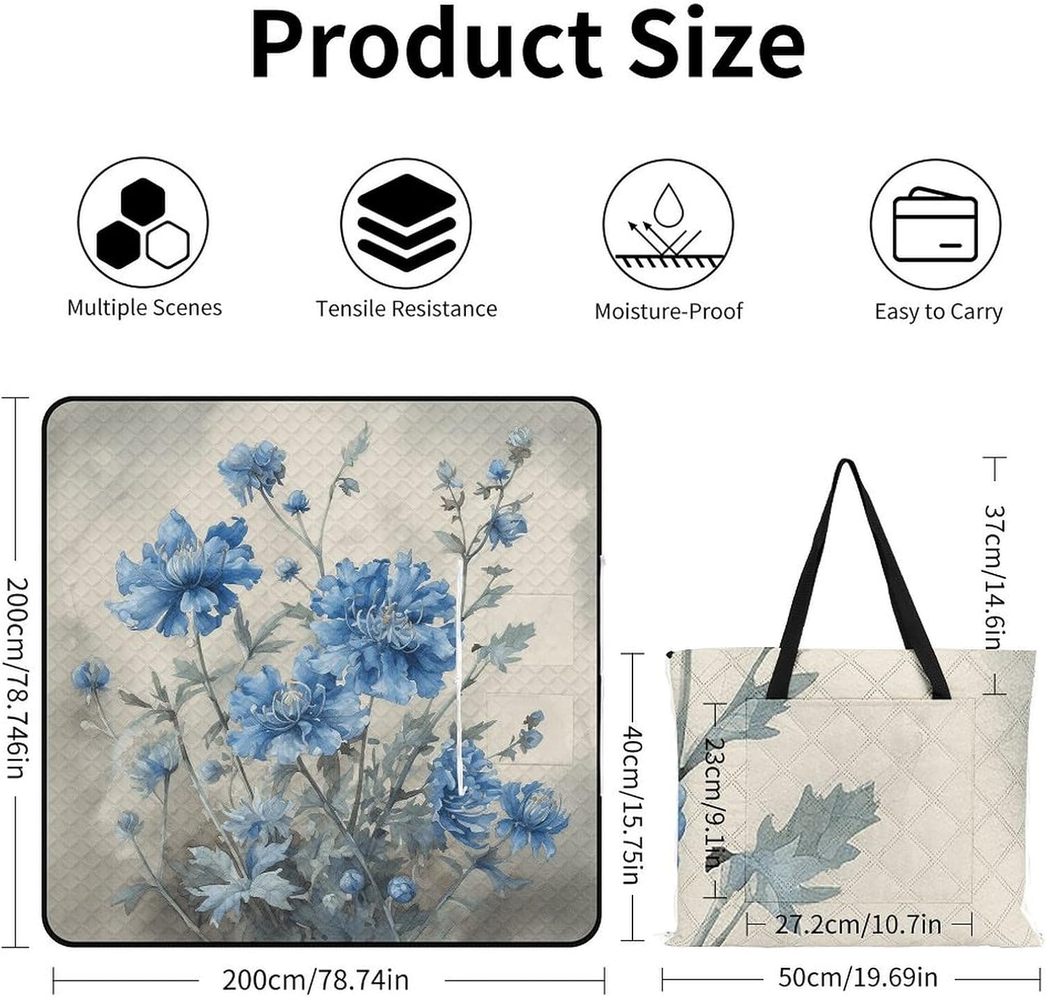 Excellent material:This Elegant Blue Flowers printed picnic blankets is made of excellent materials, ruggedized and waterproof, with excellent heat insulation performance. Whether it is wet grass or hot beach, it can provide you with a comfortable use experience and effectively protect you from the external environment. Compact and portable, easy to store:The large picnic blanket has excellent foldability and can be folded into a very mini size, which is convenient to carry and does not take up too much space. Whether it is put in a bag or a handbag, it can be easily carried, allowing you to enjoy the fun of outdoor life anytime, anywhere. Easy to clean:The upgraded waterproof surface makes the picnic mat easy to clean. Just shake or wipe it easily to remove such as mud, wet grass and beach sand, so that your picnic blanket is always clean and tidy, ready for your next use. Multifunctional design, one mat for two uses:This picnic blanket is not only a practical picnic mat, but can also be folded into a women's shopping bag. The unique multifunctional design allows you to easily switch between shopping and outdoor activities, meet your different needs, and bring more convenience to your life. Widely applicable, enjoy the outdoors:Suitable for various outdoor occasions, such as parks, beaches, family picnics, camping, travel, etc. Whether you are spending happy time with your family or exploring nature with friends, this Outdoor Camping Blanket can be your best companion, allowing you to enjoy a good time outdoors.