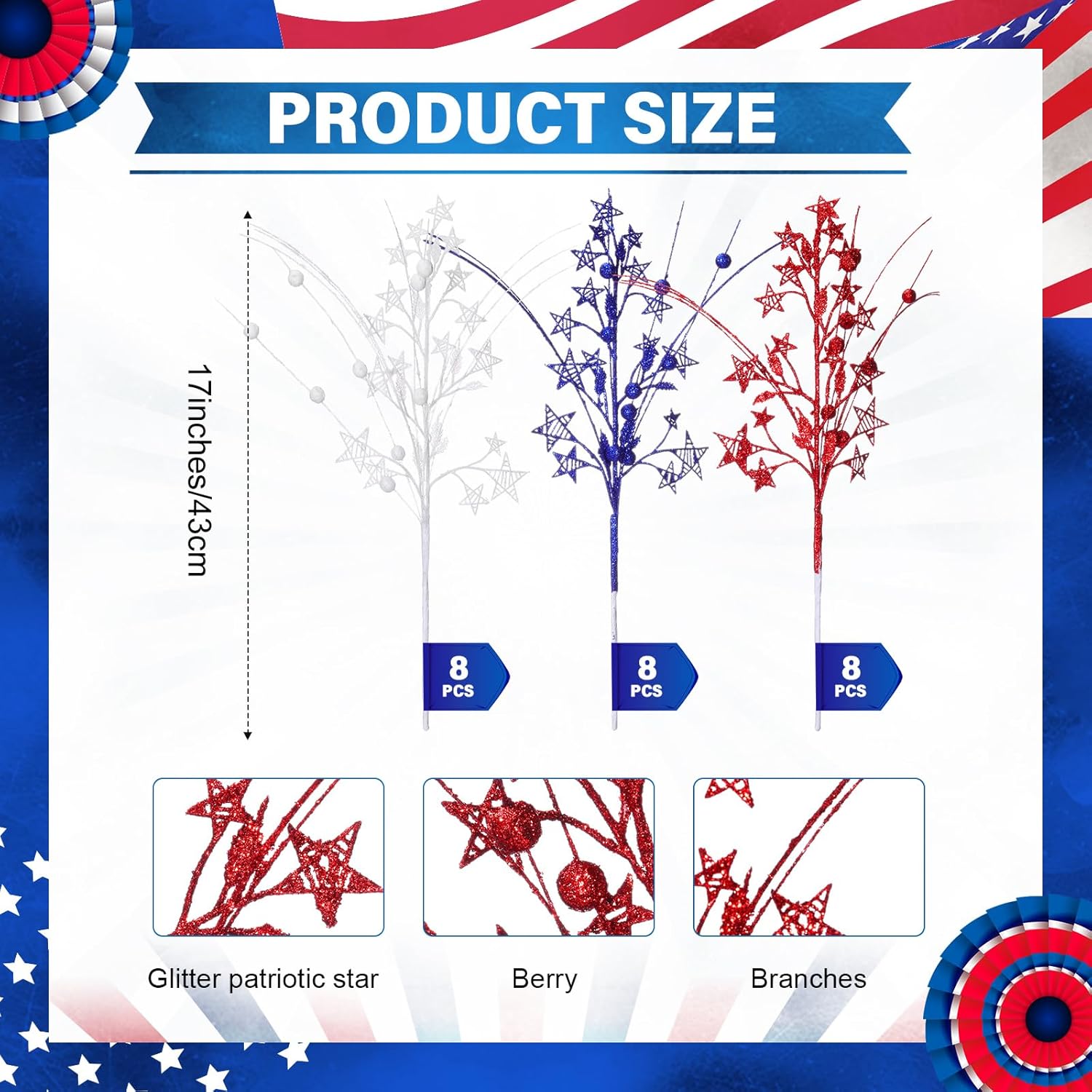 | Included Components | 24 x Artificial Patriotic Berry Stem Picks |