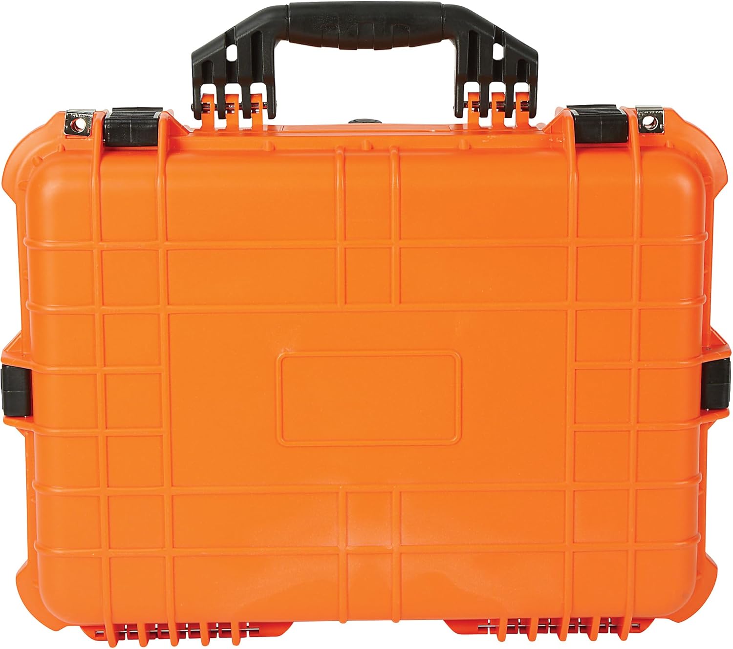 The Strongway 20in. Protective Storage Case keeps gear secure and protected in any environment. Its IP55-rated seal blocks water, dust and debris, while the high-impact polymer shell with reinforced hinges stands up to tough use. The customizable pick-and-pull foam interior cushions impacts for a precision fit, with 18in.W x 12.9in.D x 6.3in.H of protected storage space. Dual latches with padlock-ready holes lock down tight, and a pressure equalization valve ensures smooth opening after altitude or temperature changes. Orange.