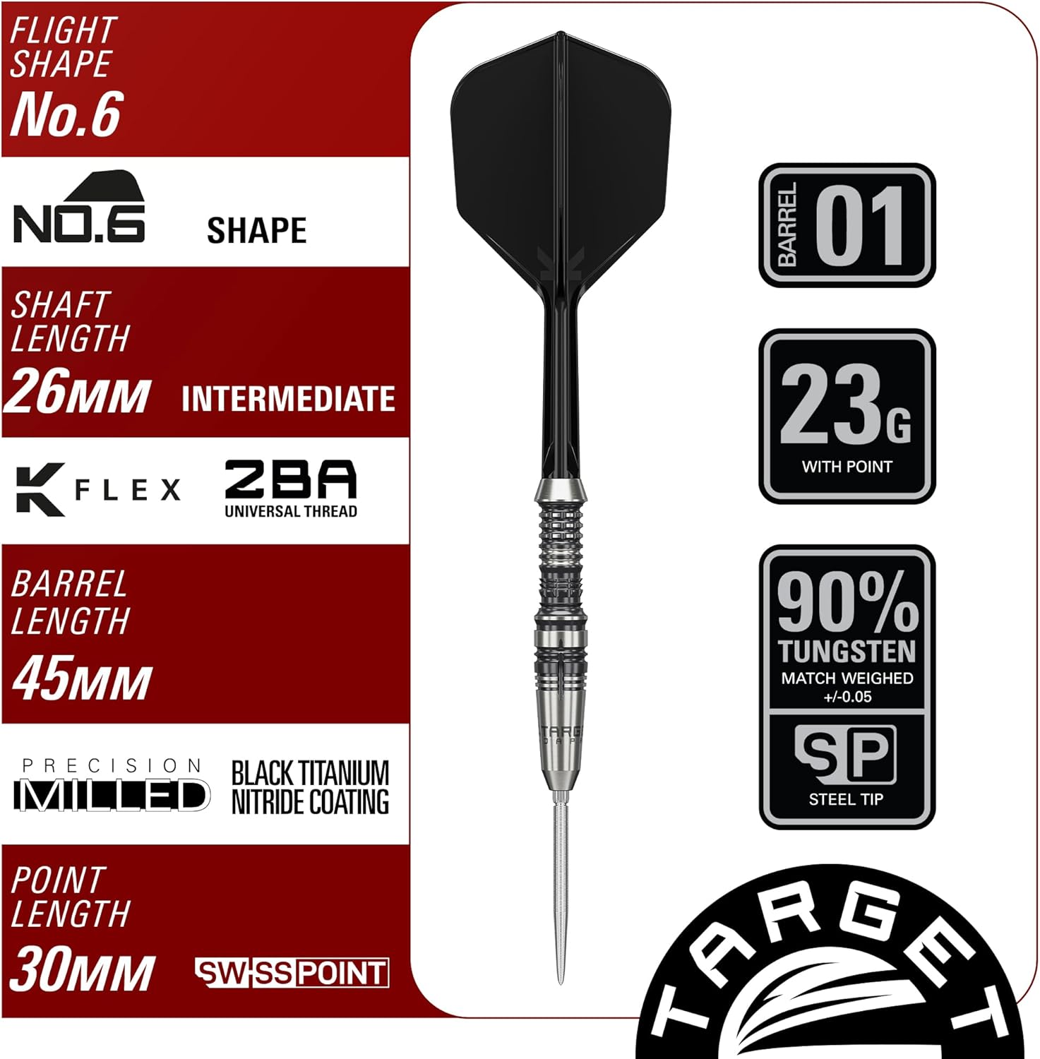| Included Components | 3x 90% Tungsten Barrels 3x Nano Swiss Points (Silver, 30mm) 3x Black K-Flex No.6 Flights and Shafts 1x Black Swiss Point Tool |