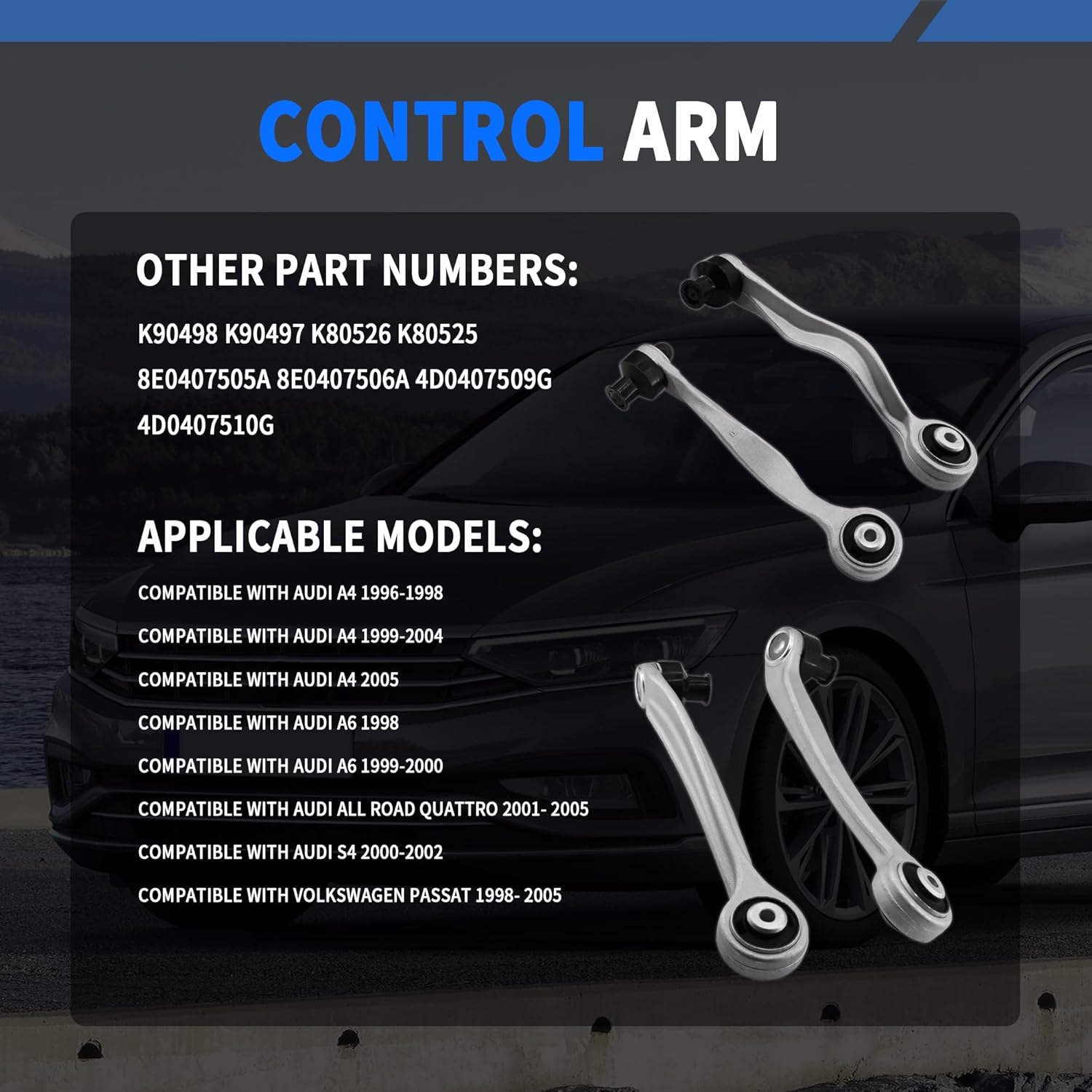 Other Part Number: 520-764, 520-763, 520-767, 520-768 8E0407510A, 8E0407510C, 8E0407510P, 8E0407509A Replacement Position: Front Upper Left Right Fitment: Compatible with Audi A4 Convertible 2003-2009 Compatible with Audi A4 Sedan 1998-2009 Compatible with Audi A4 Sedan 1997 From VIN 160001 Compatible with Audi A4 Wagon 1998-2001 Compatible with Audi A4 Wagon 2004-2005 Compatible with Audi A4 Quattro Convertible 2004-2009 Compatible with Audi A4 Quattro Sedan 1998-2008 Compatible with Audi A4 Quattro Sedan 1997 From VIN 160001 Compatible with Audi A4 Quattro Wagon 1998-2008 Compatible with Audi A6 Sedan 1998-2004 Compatible with Audi A6 Wagon 1999-2000 Compatible with Audi A6 Quattro Sedan 1998-2004 Compatible with Audi A6 Quattro Wagon 1998-2004 Compatible with Audi Allroad Quattro Wagon 2001-2005 Compatible with Audi RS6 Sedan2003-2004 Compatible with Audi S4 Sedan 8th 2000-2001 Vin Digit D Compatible with Audi S4 Sedan 8th 2002 Vin Digit D Compatible with Audi S4 Wagon 8th 2001 Vin Digit D Compatible with Audi S4 Wagon 8th 2002 Vin Digit D Compatible with Volkswagen Passat Sedan 1998-2005 Compatible with Volkswagen Passat Wagon 1998-2005 Package Included: 2 x Front Upper Frontward Control Arms - Left & Right 2 x Front Upper Rearwrd Control Arms - Left & Right