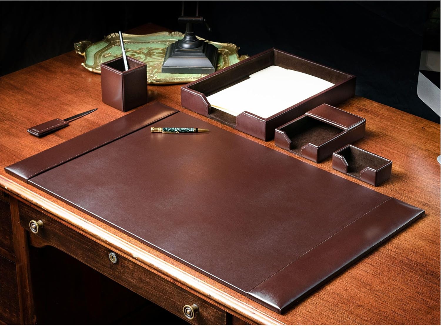 All the luxury of leather without the expense– the Dacasso Bonded Leather Desk Set Set is the ideal, timeless addition to your collection of office desk accessories. Achieve optimal desk organization without sacrificing style and sophistication. This premium set of office essentials includes a leather desk mat, leather business card holder, letter sized leather tray, letter opener, leather pen holder, and a 4” x 6” memo or notepad holder.